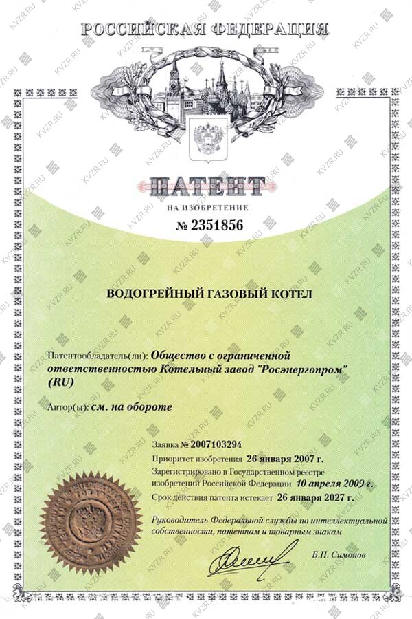 Выдан ПАТЕНТ ООО КЗ «РОСЭНЕРГОПРОМ» на изобретение ВОДОГРЕЙНЫЙ ГАЗОВЫЙ КОТЕЛ