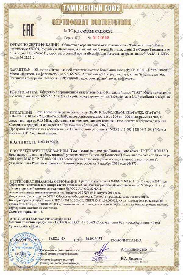 Получен сертификат соответствия на котлы паровые типа КПр-К, КПа-ЛЖ, КПа-М, КПа-Гн/ЛЖ, КПа-Гн/М, КПа-Гс/ЛЖ, КПа-ГС/М, КПа-Гн, КПа